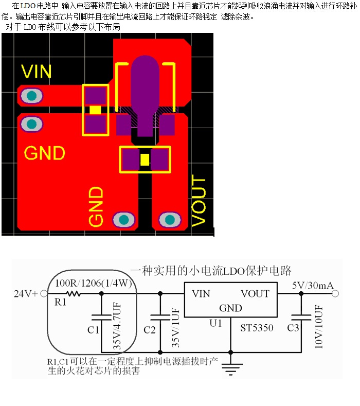 此電路適合小電流LDO的保護(hù) 前端的電阻在有效抑制浪涌的同時也分擔(dān)掉一部分壓降可以是LDO芯片溫度降低 同樣的條件下輸出電流更大。