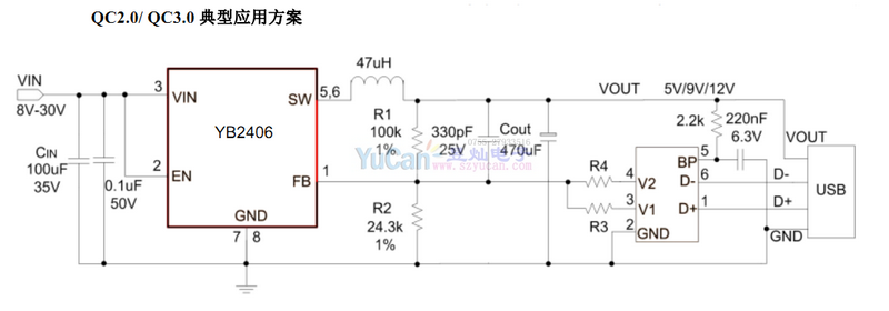 YB2406內(nèi)置線電壓補(bǔ)償,可通過調(diào)節(jié)FB端口的分壓電阻阻值來實(shí)現(xiàn).YB2406不僅可實(shí)現(xiàn)單芯片降壓電源管理方案,還可以與QC20/QC30識(shí)別芯片構(gòu)成快速充電電源管理方案。另外,芯片包含多重保護(hù)功能:過溫保護(hù),輸出短路保護(hù)和輸入欠壓過壓保護(hù)等。